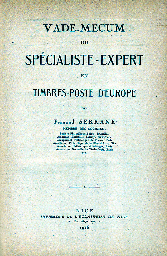 | Vade-Mecum du Spécialiste-Expert en Timbres-Poste D'Europe |  | | | | Autor: Fernand Serrane von: 1926 | | Seiten: 480 als Hardcover | | | | STATUS: NUR ZUM AUSLEIHEN |