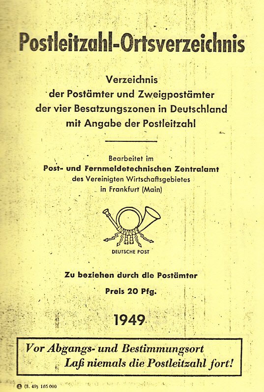 | Postleitzahl-Ortsverzeichnis 1949 |  | | | Verzeichnis der Postämter und Zweigpostämter der vier besatzungszonen | | Autor: Post- und Fernmeldetechnischen Zentralamt von: 1949 | | Seiten: 37 als Ringheftung s/w | | Kopie | | | STATUS: NUR ZUM AUSLEIHEN |