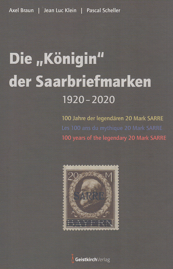 | Die "Königin" der Saarbriefmarken 1920-2020 |  | | | | Autor: Axel Braun / Pascal Scheller / Dr. Jean Luc Klein von: 2022 | | Seiten: 100 als Hardcover mehrfarbig | | mehrsprachig | | | STATUS: NUR ZUM AUSLEIHEN |