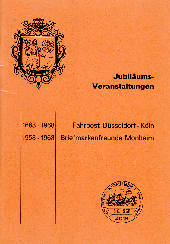 | Jubiläums-Veranstaltungen |  | | | 1668-1968 Fahrpost Düsseldorf - Köln / 1958-1968 Briefmarkenfreunde Monheim | | Autor: Briefmarkenfreunde Monheim von: 1968 | | Seiten: 64 als Paperback s/w | | | | STATUS: NUR ZUM AUSLEIHEN |