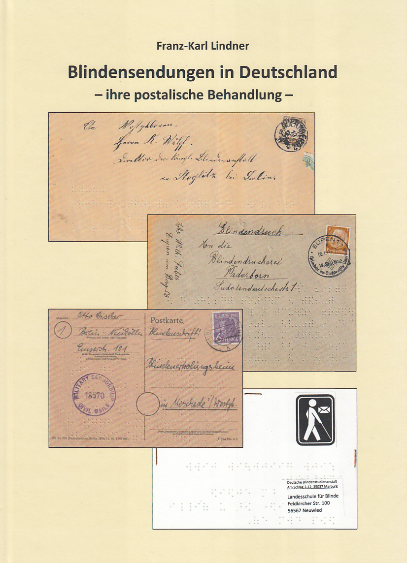 | Blindensendungen in Deutschland |  | | | - ihre postalische Behandlung - | | Autor: Franz-Karl Lindner von: | | Seiten: 90 als Hardcover mehrfarbig | | | | STATUS: NUR ZUM AUSLEIHEN |