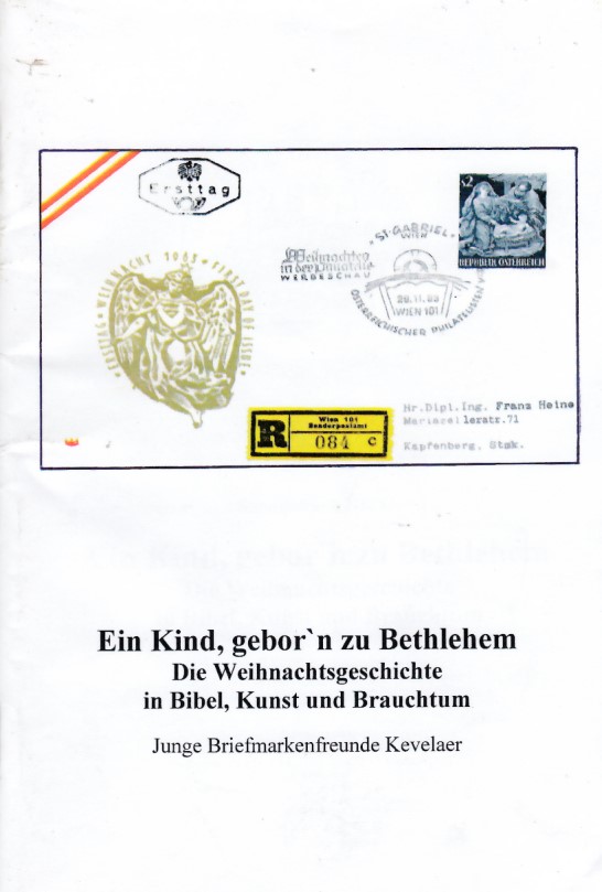 | Ein Kind gebor´n zu Bethlehem |  | SONDERDRUCK Nr.: 85 | | Die Weihnachtsgeschichte in Bibel, Kunst und Brauchtum | | Autor: Junge Briefmarkenfreunde Kevelaer von: 2008 | | Seiten: 56 als DinA 5 / 4-farb Umschlag und Innen s/w | | | | STATUS: VORHANDEN |
